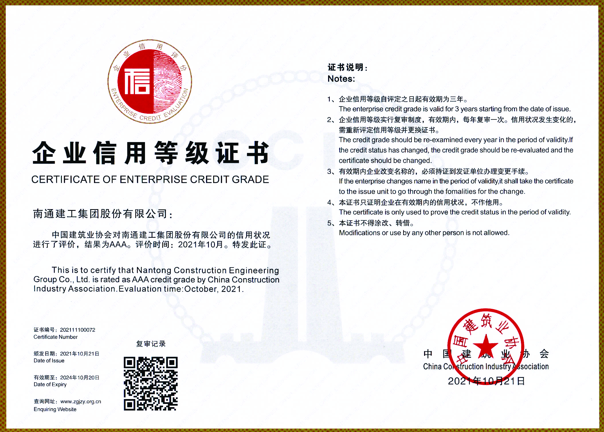 多年来,南通建工集团始终秉承“建楼育人,奉献社会”的企业宗旨,把诚信经营建设作为促进企业转型升级的一项重要任务持续抓、重点抓,坚持把诚信建设贯穿于经营管理全过程,形成企业发展与诚信建设同步提高,取得了良好的社会效益和经济效益。站在“十四五”新起点上,公司将继续发挥行业示范引领作用,进一步推动诚信体系建设,规范市场行为,向社会奉献更多精品工程,努力谱写民营建筑企业高质量发展和推动社会进步的新篇章。
