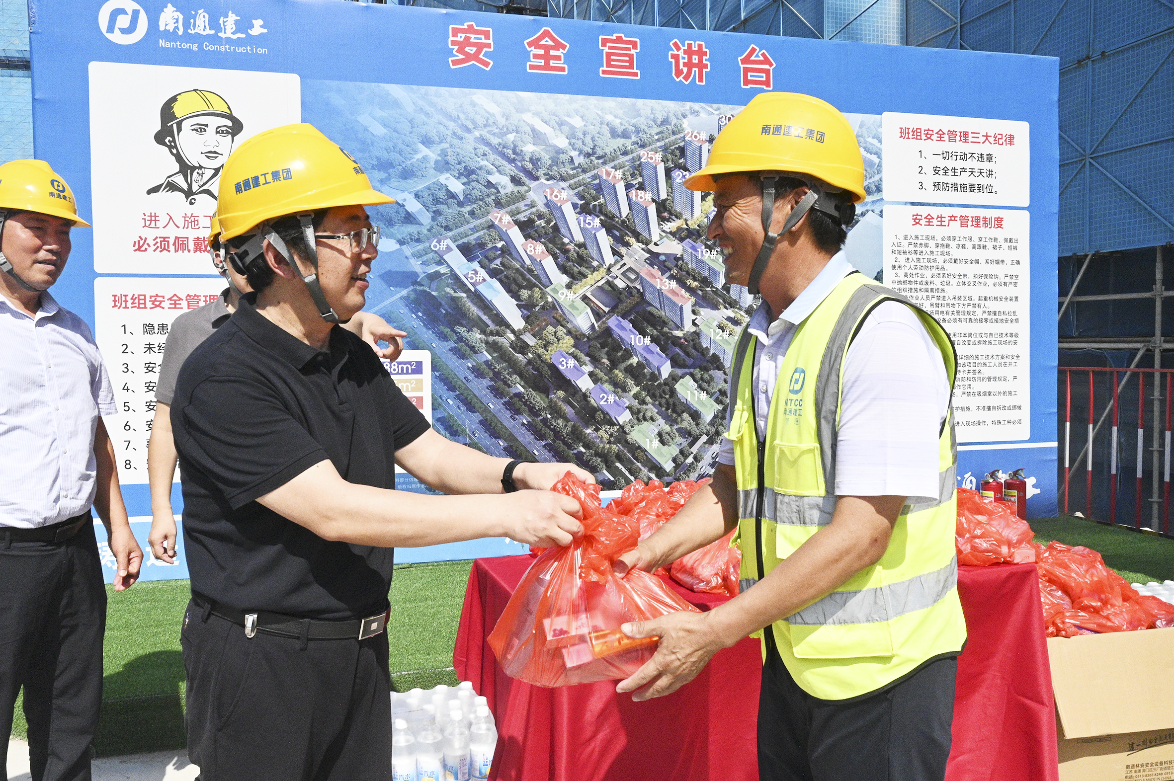 入夏以来,持续高温,烈日当空,骄阳似火,公司各项目部一线职工挥洒汗水、坚守岗位。奋战在高温一线职工的生产生活情况怎样?项目部防暑降温和高温季节安全生产工作做得如何?这些都牵动着集团公司领导的心。7月22日,集团公司董事长张向阳率队深入南通片项目慰问高温一线职工,拉开了今年公司夏季高温慰问活动的序幕。集团公司党委副书记兼三分公司总经理钟一鸣、副总经理兼一分公司总经理邱林、工会主席王少波等参加了慰问活动。