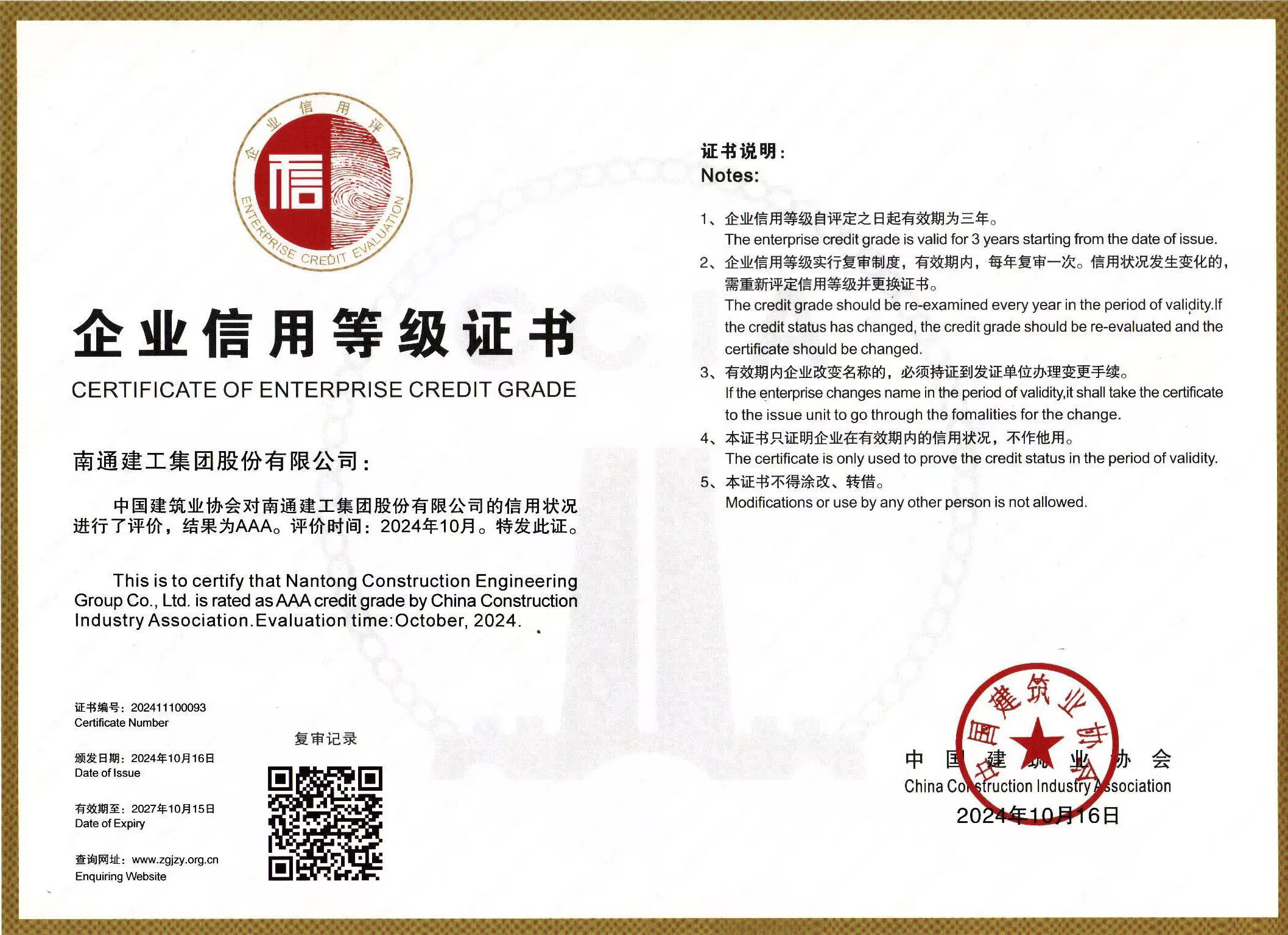 该评价由中国建筑业协会组织评定,是国家级建筑业企业综合能力最高评价。主要对企业基本素质、诚信履约、经营能力及财务指标、管理能力等主要指标进行全方位考核,每年评定一次,评价结果有效期3年(期间复审2次),AAA级是最高信用等级,代表着对企业在积极履行社会责任、诚信经营、信用记录良好等方面的充分肯定。