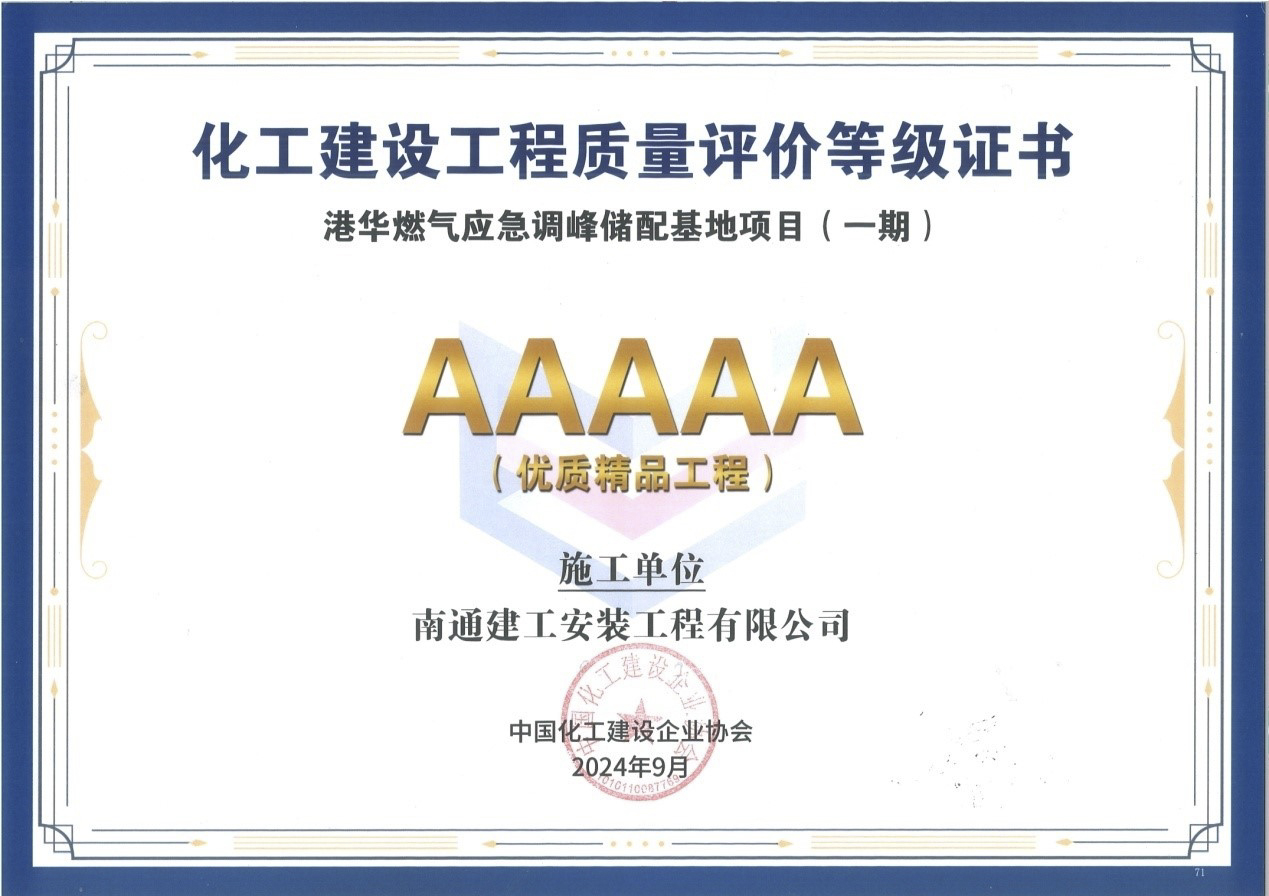 近日,中国化工施工企业协会2024年化工建设工程质量评价结果公布,由建工安装参建的港华燃气应急调峰储配基地项目(一期)榜上有名,喜获优质精品工程奖。
