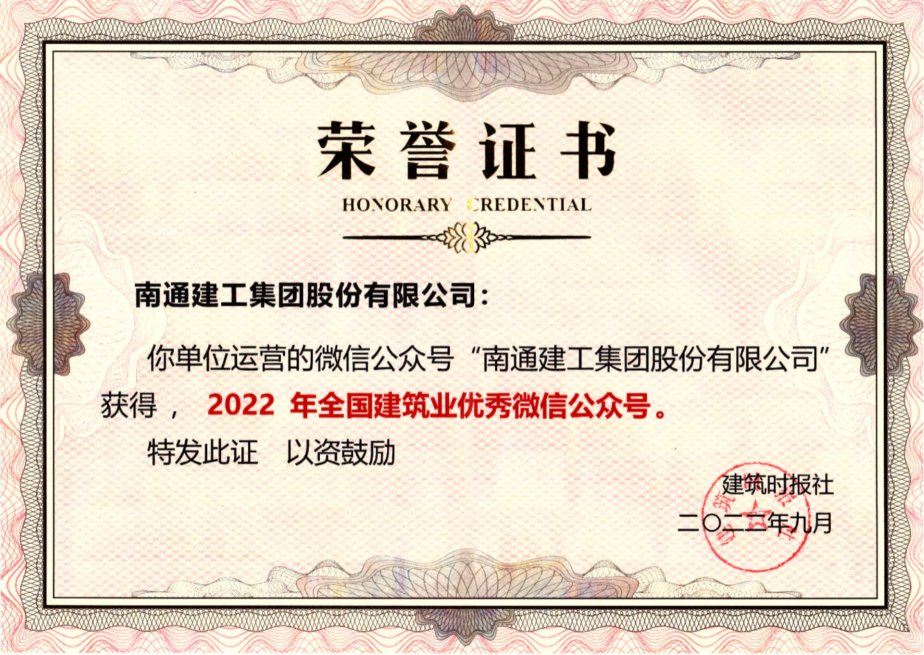 会上,南通建工集团微信公众号凭借浏览量、原创度、发布频率、转发量等诸多方面的综合优势,再次荣获“2022年全国建筑业优秀微信公众号”。